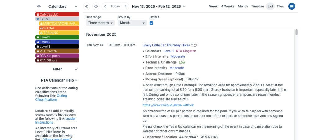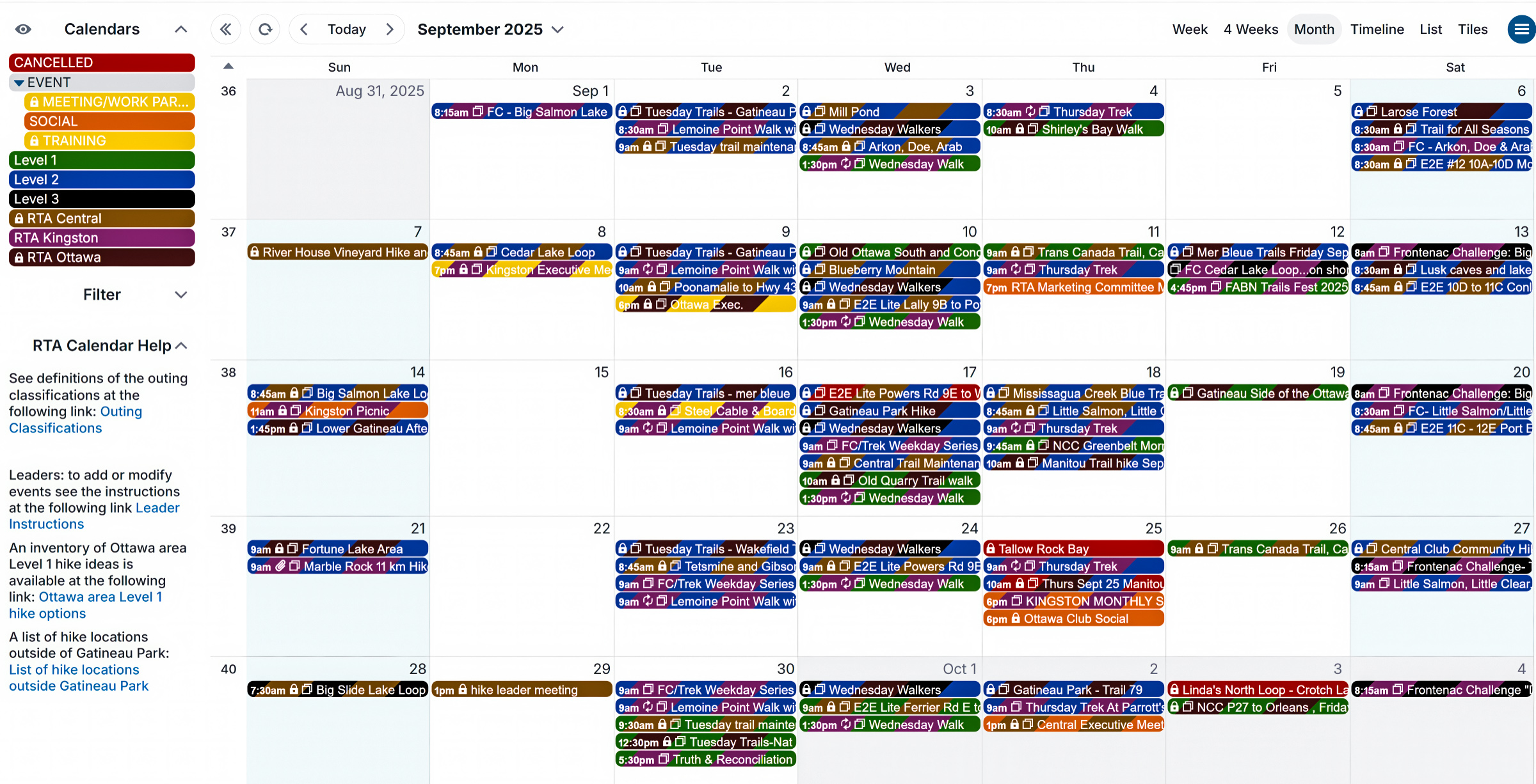 For most activities, RTA members sign up using the RTA Activities Calendar, which uses a service called “Team Up”. Events are posted on a calendar that shows a four-week period using a colour coding indicating the type of event and which club is hosting the event. Clicking on the event brings the member to further descriptions of the event, typically a hike, or a social event or meeting, and gives them the ability to sign up. An example of a five-week event view of the calendar is shown below (in order to show a full month):